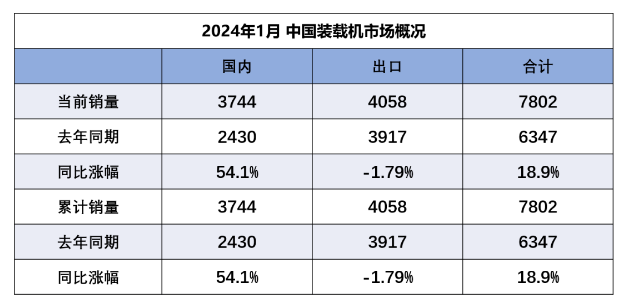 2024年1月份挖掘机、装载机销量分析:国内大幅增长,出口小幅回落